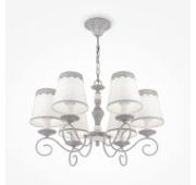 Металлическая арматура золотого оттенка. Абажуры – текстиль на ПВХ кремового цвета. Трендовый керамический декор с имитацией мрамора. Источник света – лампа с цоколем E14.